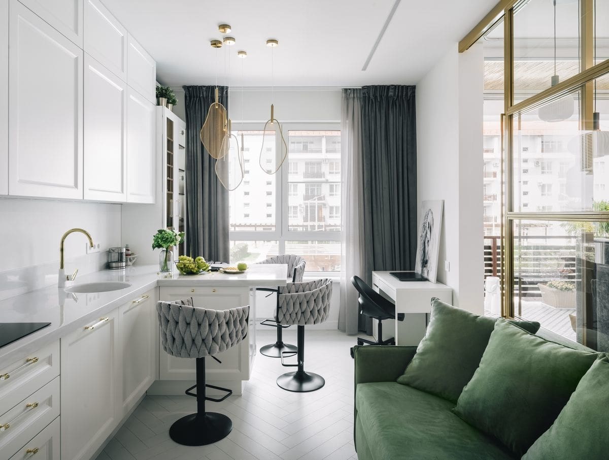Входит в уборку: Вымыть посуду; протереть фасады шкафов; отмыть плиту, включая решётку, ручки и фасад; протереть холодильник; протереть зеркала; протереть снаружи от пыли и жира бытовую технику, которая стоит на виду: чайник, кофемашину, комбайн, тостер, мультиварку и прочее; протереть телевизор; помыть подоконник и батареи, протереть видимую часть трубы; протереть обеденный стол и стулья, включая ножки; протереть навесные полки и картины; протереть от пыли светильники (кроме люстры); отмыть кран и раковину; помыть столешницу; протереть выключатели и розетки; протереть дверь и дверной блок; собрать мусор; вымыть плинтусы и полы.